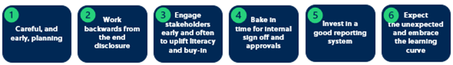 Begin with a storyboard of what you want your final disclosure to look like, sound like and feel like – the key messages you want to convey, the graphics you want to generate. A draft structure provides a foundation for discussion, alignment, and iteration and helps key stakeholders visualise the end product and understand what they might need to prepare for and how their contributions will fit into the end picture.